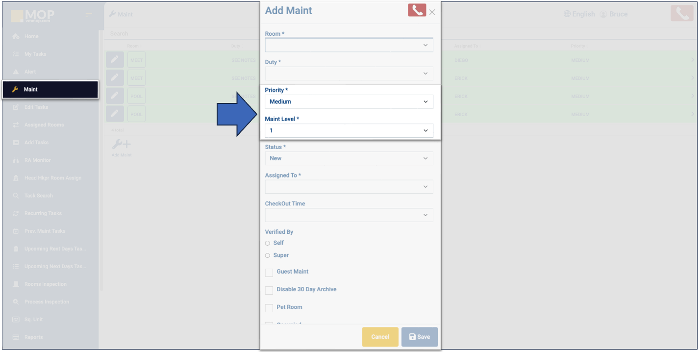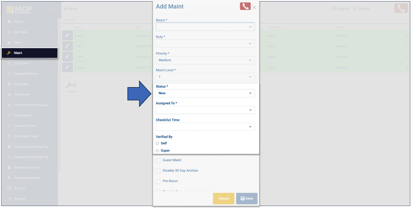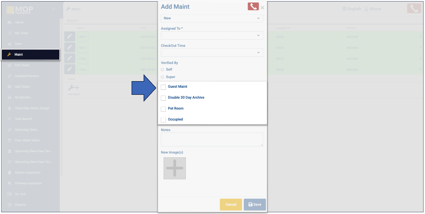 - Guest Maint: if the work order was submitted by a client and not by a team member, check the box.