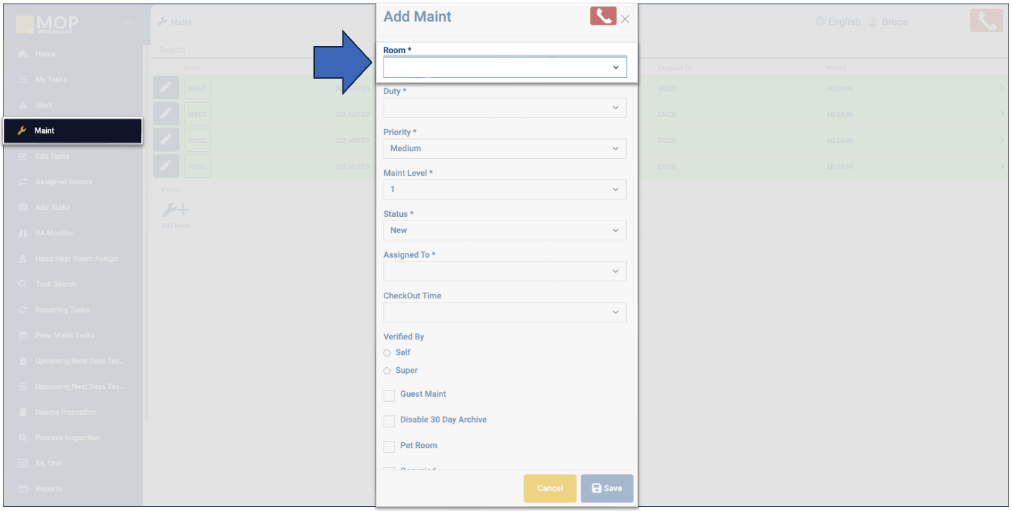 2. Select the room number or the property area where the maintenance is to be done.