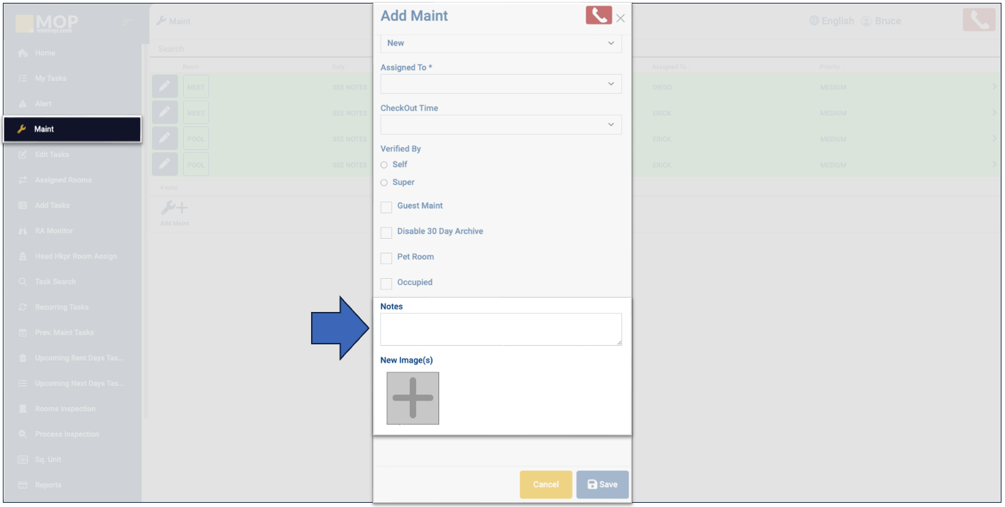 7. Use the "Notes" field to add any information useful to the completion of the task. As well you can udelize the "New Image(s)" option to add photos from your computer or phone.