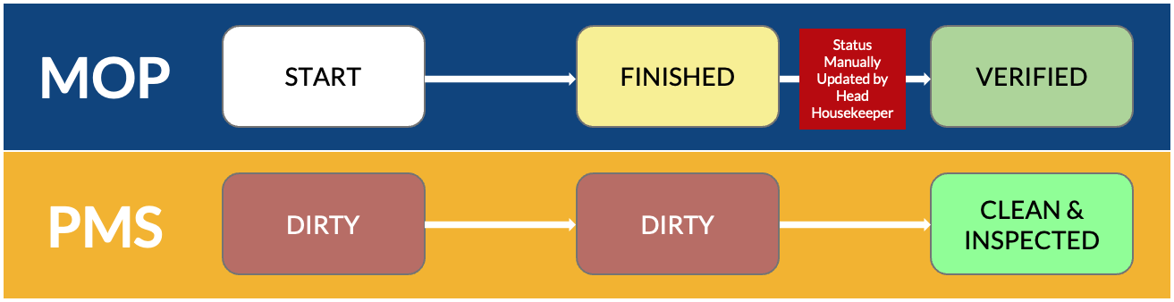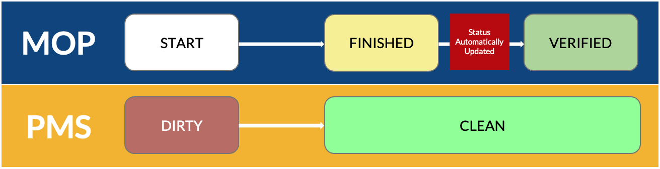 Since each application includes a room status condition, there is also a mapping table that establishes the corresponding statuses between MOP and VM PMS. This table is hard-coded in the interface between MOP and VM PMS and cannot be customized.